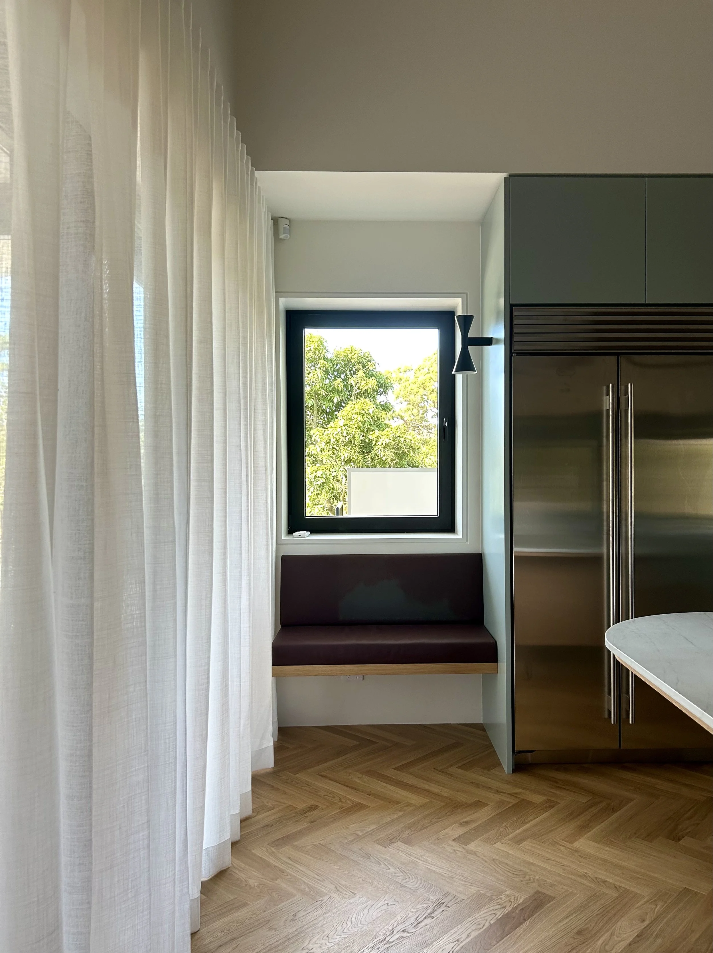 Internal alterations aimed to improve connections between living spaces and the outdoors whilst improving functionality. The new gable roof form allows for spacious ceilings guiding the eye towards the bay views. Finishes focused on bringing warmth and colour into the space with a new herringbone timber floor throughout.
